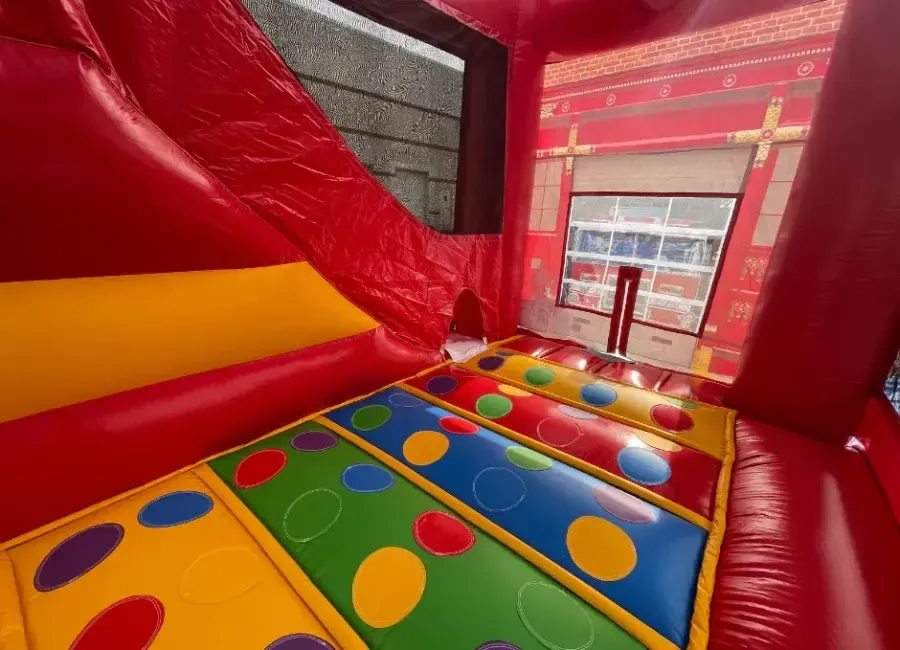 This fire-fighting combo bouncer is one of our most popular inflatables. It has a large bouncing area with basketball hoop, Twister mat, climbing wall, and slide with a hose hookup.